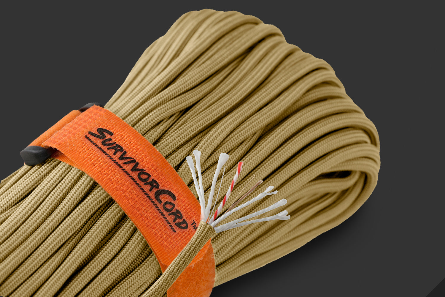 SURVIVORCORD = 550 Paracord + Mono-Filament Fishing Line + Multi-Purpose Utility Wire + Waterproof Fire Tinder
