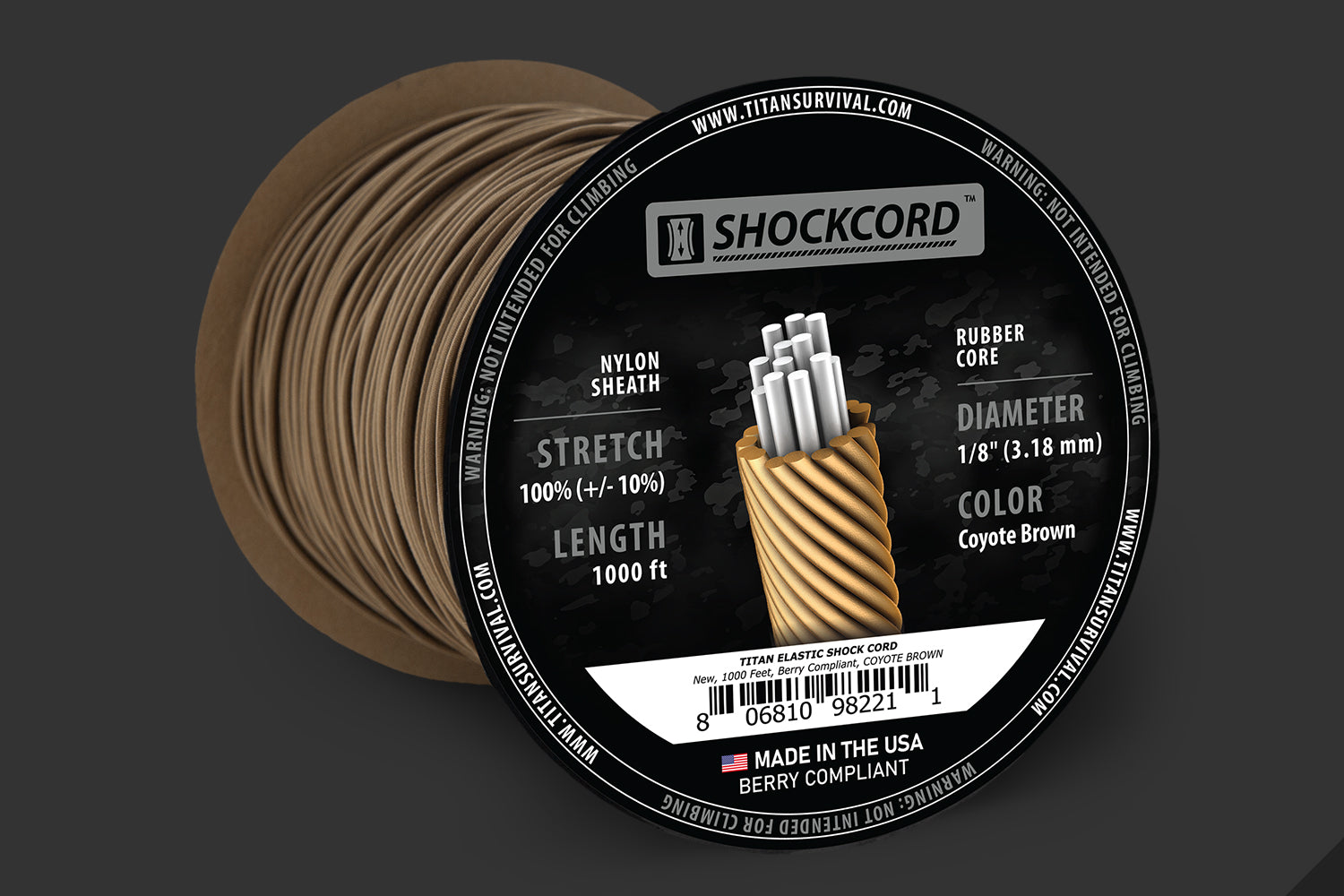 ShockCord is a strong, elastic cordage used to secure items to backpacks or vehicles in the military. Commonly used to create "Bungie Cord" in civilian life, our ShockCord is 100% Berry Compliant, Made in the USA, and guaranteed for life. ShockCord has 100% stretch, a tensile strength of ~100 LBS, and is ideal for creating bungee cords and securing or tethering items to you trailers, boats, vehicles, roof racks, backpacks, bug-out bags, tarps, and so much more.